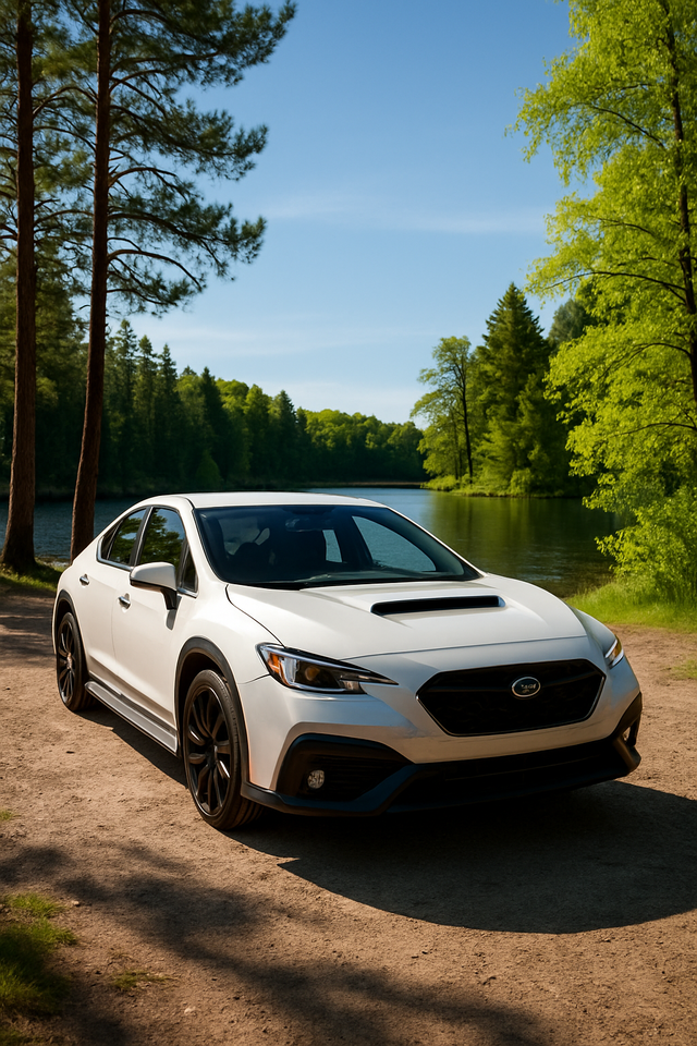 "this car at a lakefront in the woods on a sunny day, with a with a stunningly beautiful tanned 25 year old Korean woman in a medium teal bikini, partial smile, and bare feet leaning on the side of the car"