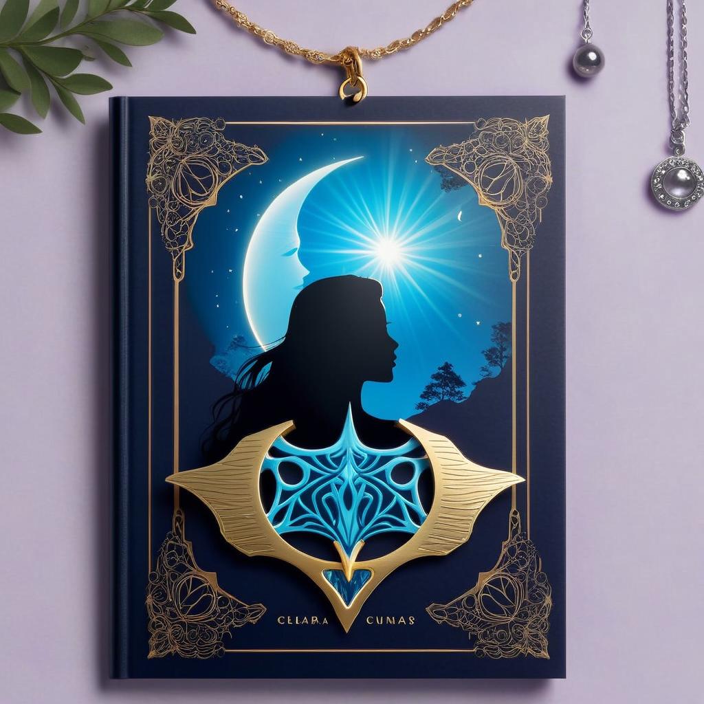 "Crea una imagen similar, tamaño completo. Reemplaza el dibujo con un collar de media luna junto a un sol y la silueta de una chica. Que sea de genero fantasía."
