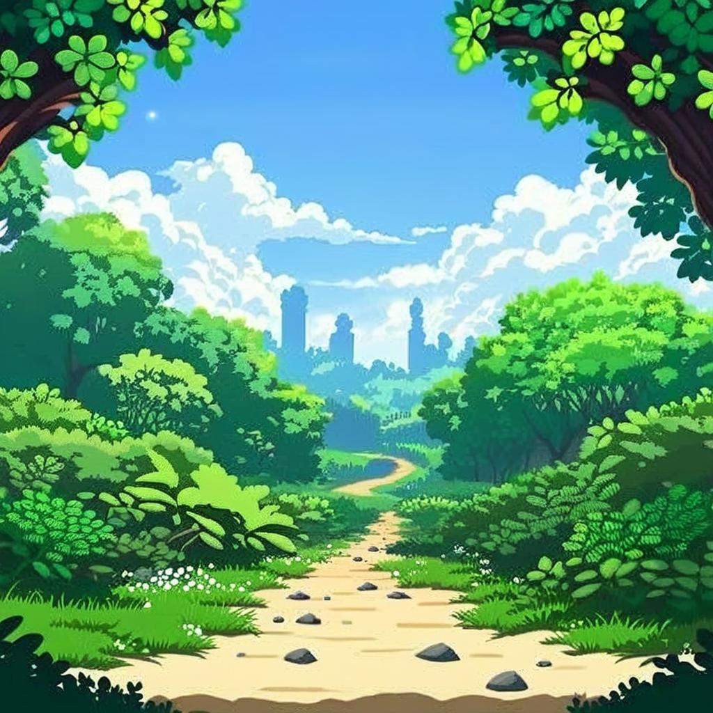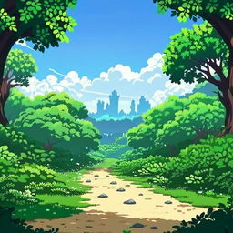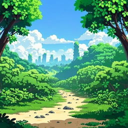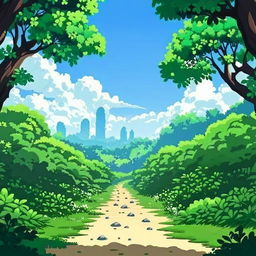 "Quero uma, píxel Arte de uma floresta que nas laterais tenha algumas árvores, flores e arbustos e no meio tenha uma estrada de terra com um pouco de grama e bem la no fundo, uma vila simples"