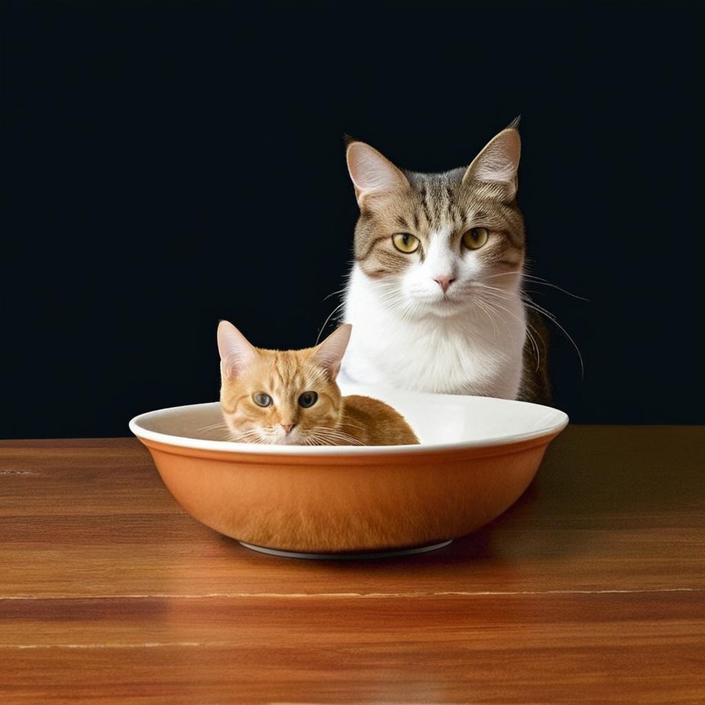 "Manipulation this images, the thing that you'll be making is this. "Instruction: Make this images in one place which there is a background photo, that is you'll be using as a background and there is a cat which is, the cat will be play the role as a human or human size, and the next this is there is a bowl which sho..."