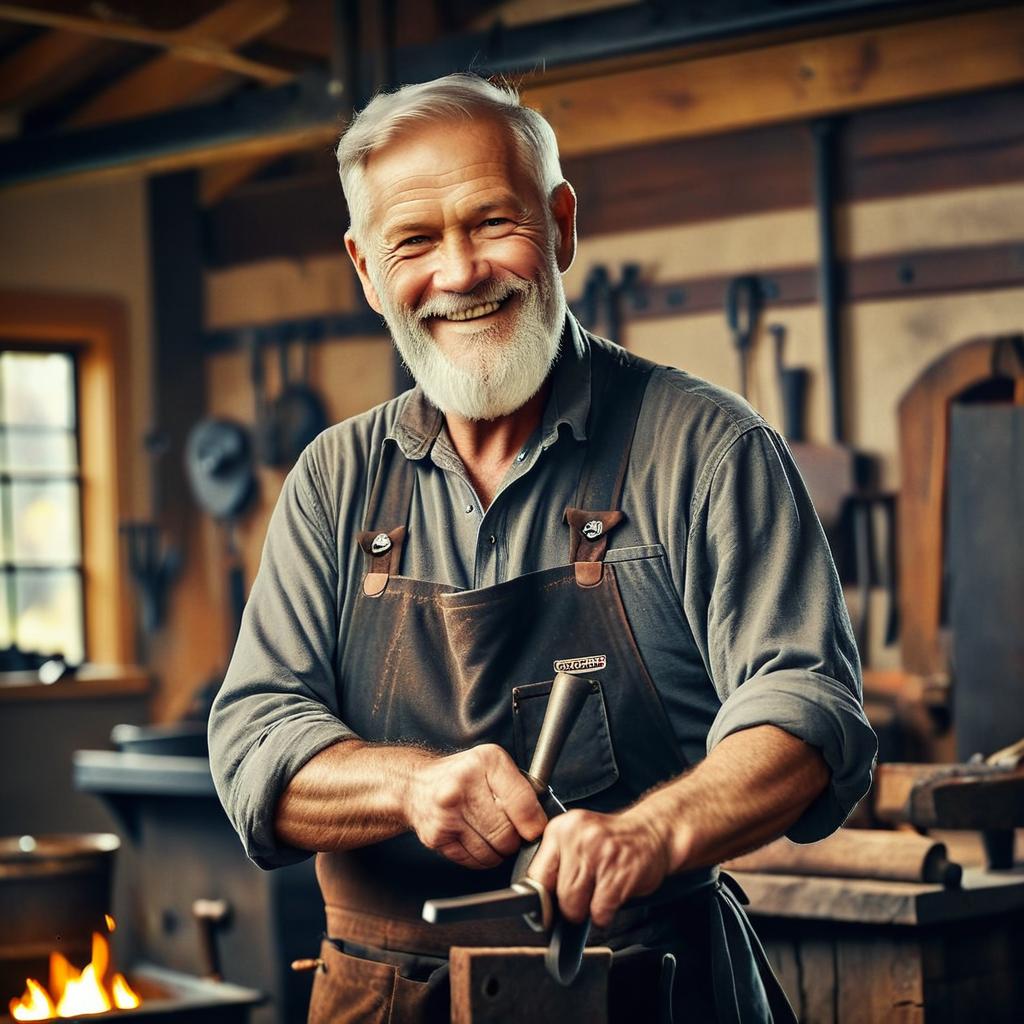 "older man, blacksmith, grizzled, jovial, well groomed, short well-kept hair and beard"