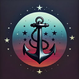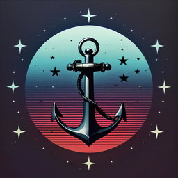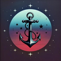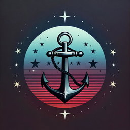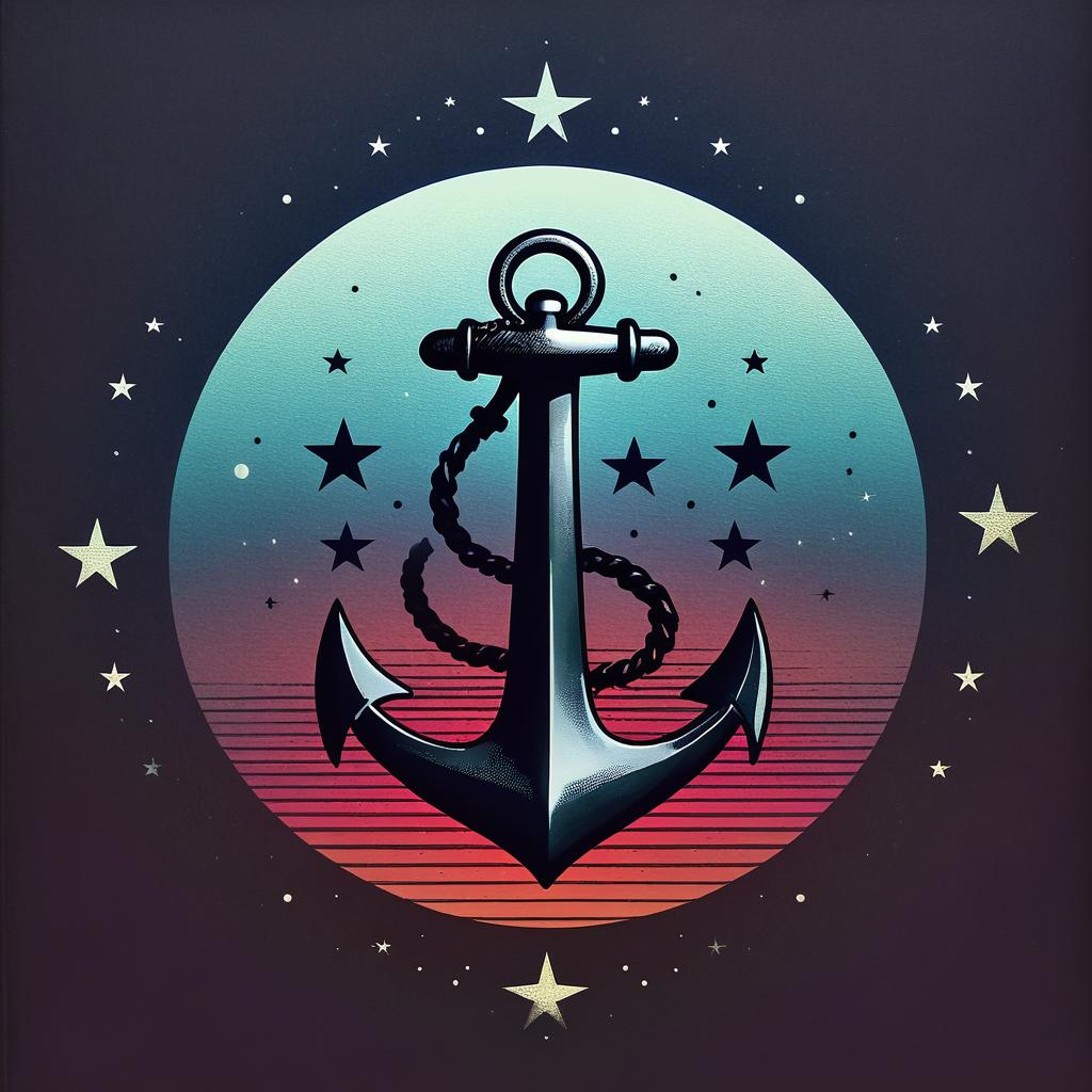 "In the background, there are tiny but unobtrusive stars on the gradient consisting of the colors #2b2548, #8e4f53, #11100c. Above that, prominently in the middle of the page, is a sea anchor."