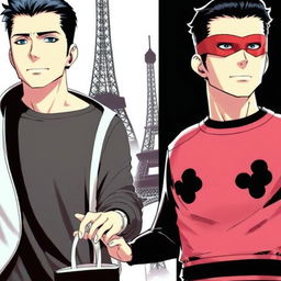 "Use este personagem a direita, com os mesmos traços, mais sobrevoando a torre eiffel a noite, enquanto uma gosma preta quiser imperceptível está grudada na torre."