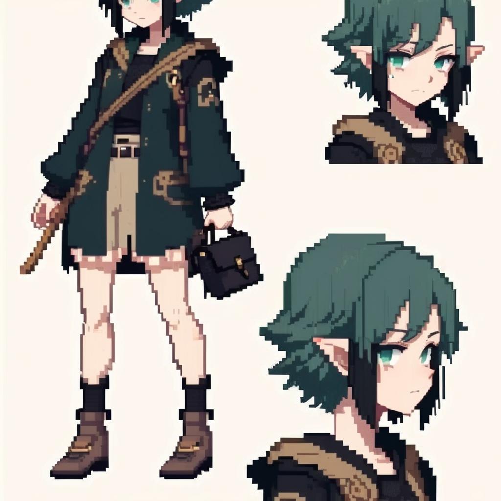 "Pixel art, A full-length girl with black hair, fantasy style, slightly torn clothes, reminiscent of the style of sand children, on a neutral background"