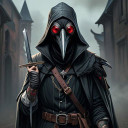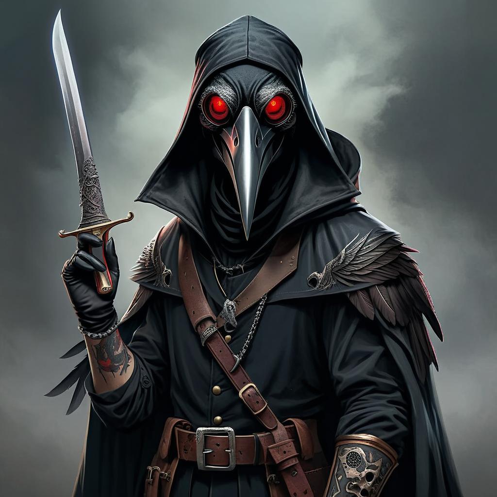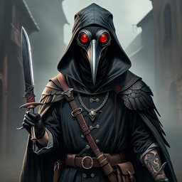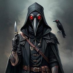 "fullbody medieval plague doctor design with raven mask and red goggles and third eye and scalpel weapon and tattoos without hat"