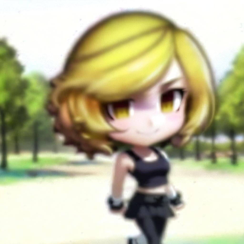 "anime girl, happy, plump, white skin, blonde hair, shoulder haircut, curly edges, black sports bra, black leggings, walking in park, standing, side view"