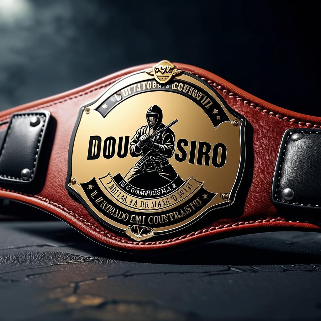 ""Um cinturão de campeonato de Jiu-Jitsu estilizado, com uma placa dourada ao centro e detalhes de couro preto e costuras laranjas. Na placa central, o nome 'COLISÃO BJJ' aparece em letras grandes e pretas, acompanhado de uma ilustração de um samurai acima do texto. Abaixo, está escrito 'BRAZILIAN JIU-JITSU'. O fundo..."