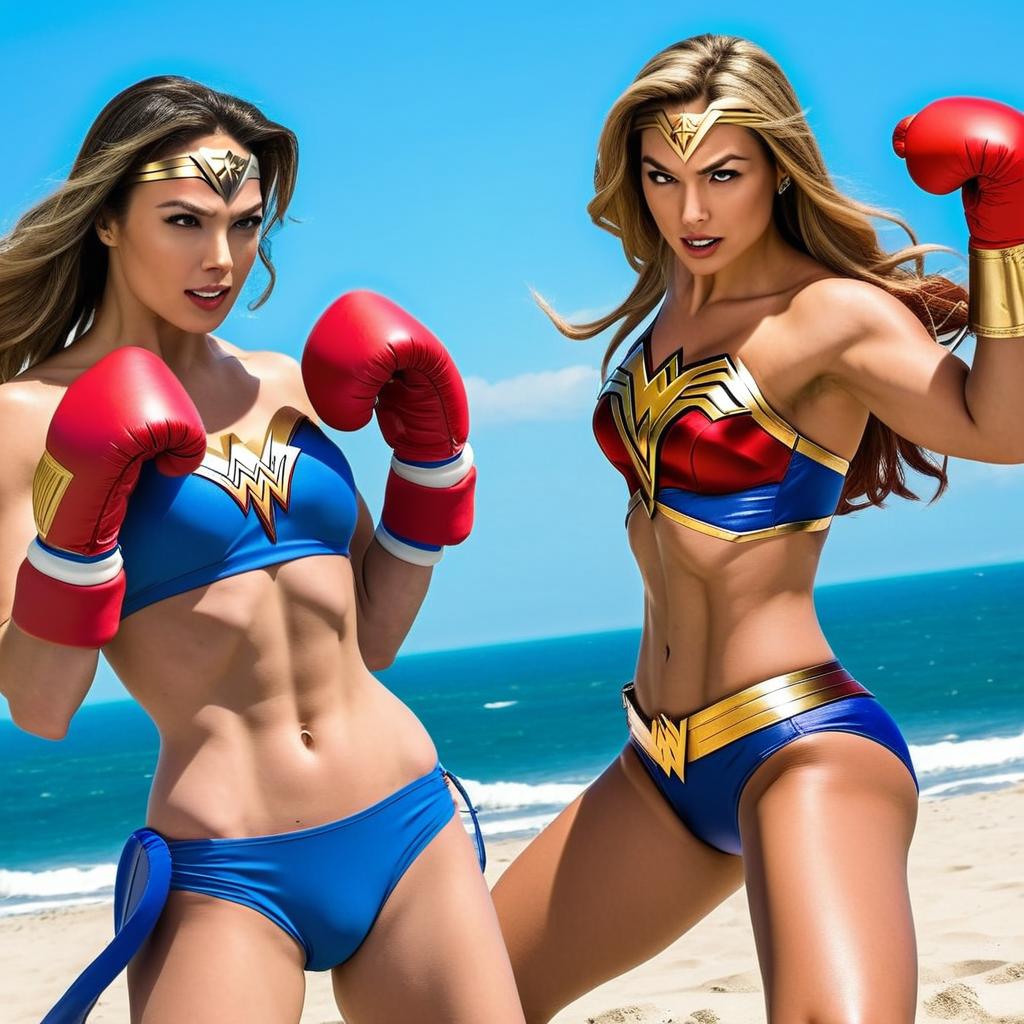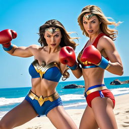 "Wonder woman vs Supergirl -beach bikini boxing with boxing gloves"