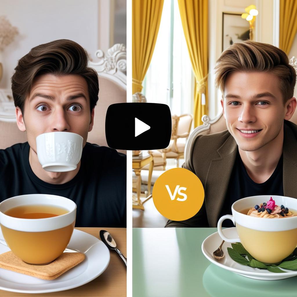"Make a thumbnail for YouTube. And the topic is expensive tea vs cheap Tea . The thumbnail will be looked like this .. only the face will be different"