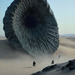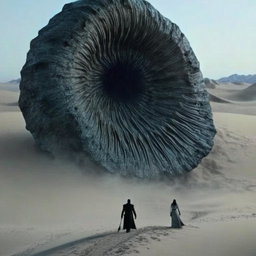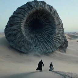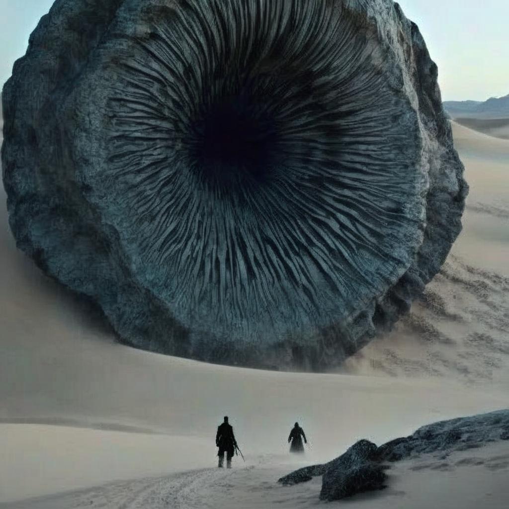 ""用Expressionism art style画一幅电影海报,电影为沙丘(DUNE),海报主体为一个巨大的沙丘,沙丘顶端站着主角保罗(背光,穿着长袍戴着兜帽),沙丘背后一只巨大沙虫(我发的图像里面的沙虫),整体呈现暗橙黄色,体现出明显光影,体现出人类的渺小,沙丘的浩瀚“"