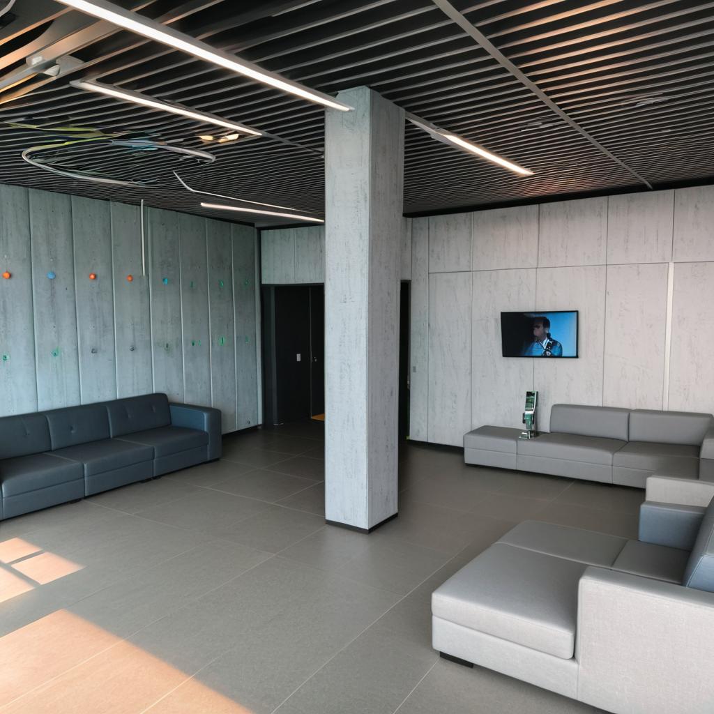 "pls make this space a cozy lounge for students to relax and socialize, with sofa sets, bookshelf, smart devices,with mixed color of white, blue, orange, grey, silver. And it would look modern smart."
