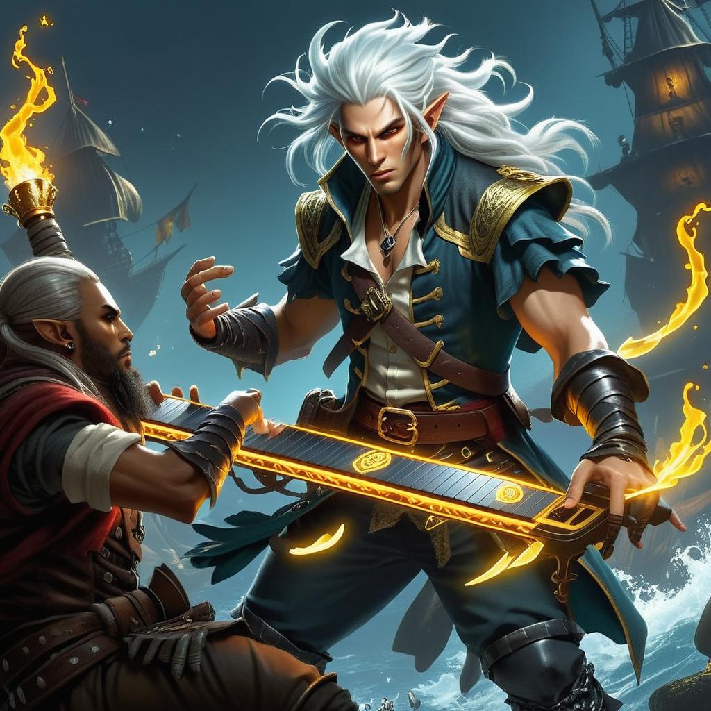 "An unserious half-elf bard in in the pirate era, he stands at 7 feet tall and is playing a small hand piano while fighting some burly rogues wearing a serpentine crest. He has platinum hair and radiant platinum eyes, magic veins are glowing gold down his face and eyes."