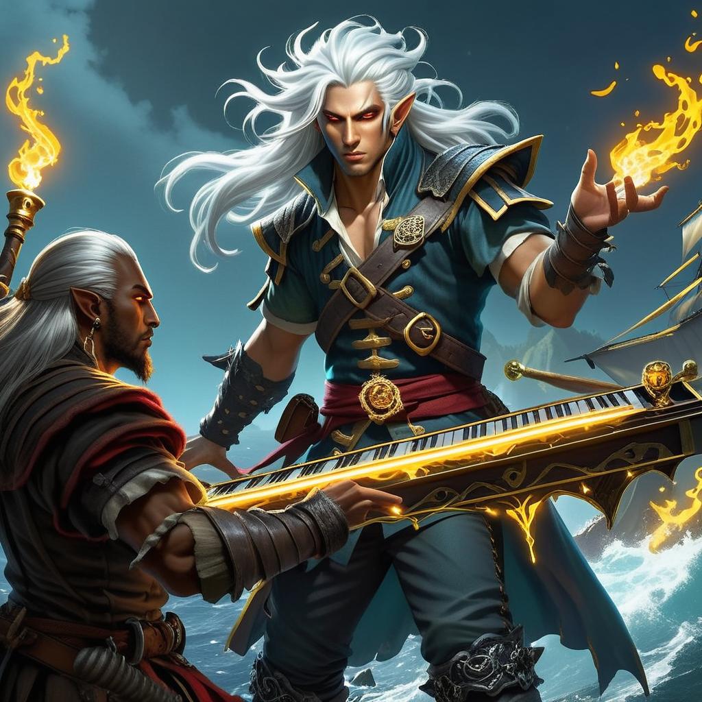 "An unserious half-elf bard in in the pirate era, he stands at 7 feet tall and is playing a small hand piano while fighting some burly rogues wearing a serpentine crest. He has platinum hair and radiant platinum eyes, magic veins are glowing gold down his face and eyes."