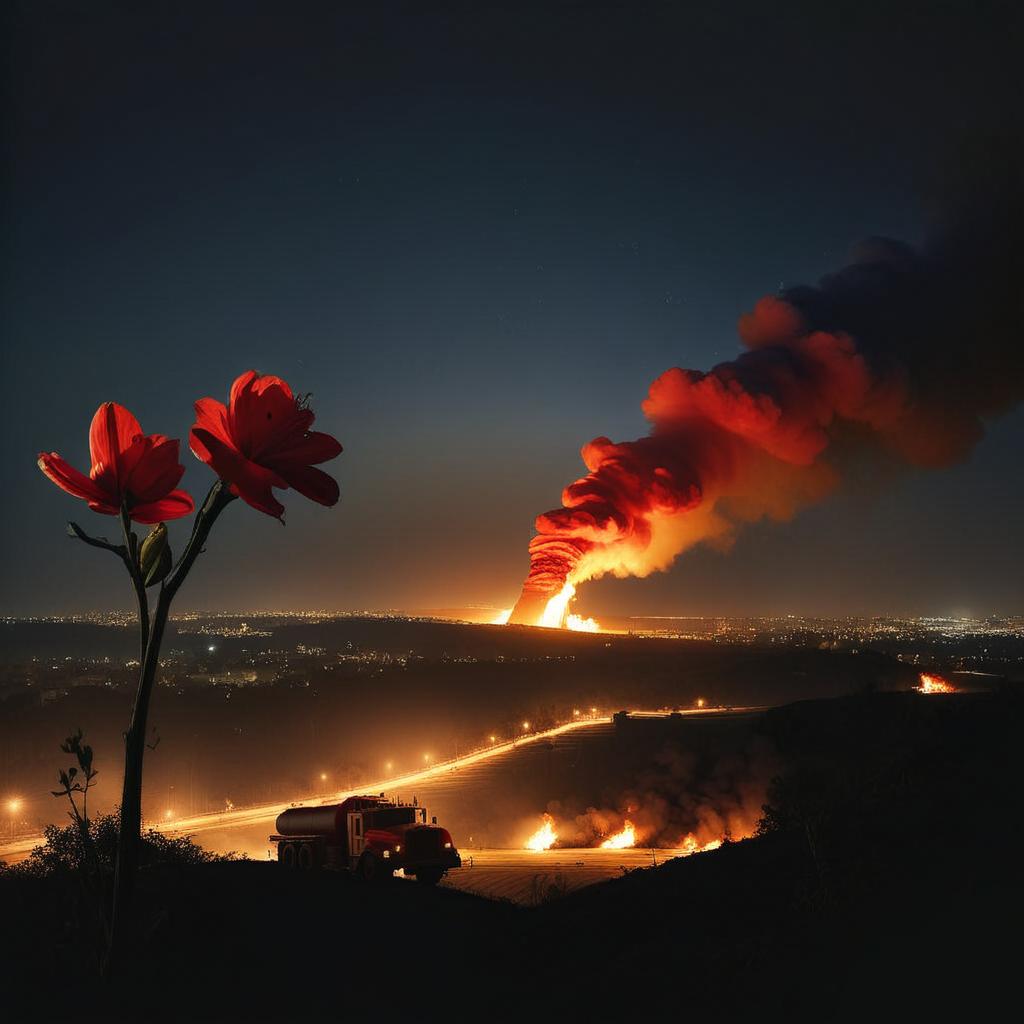 "Combine imagen. The burning tanker truck must be in the city, far far away. see people and shadows in the distance in the city of desperate people. only a single explosion"