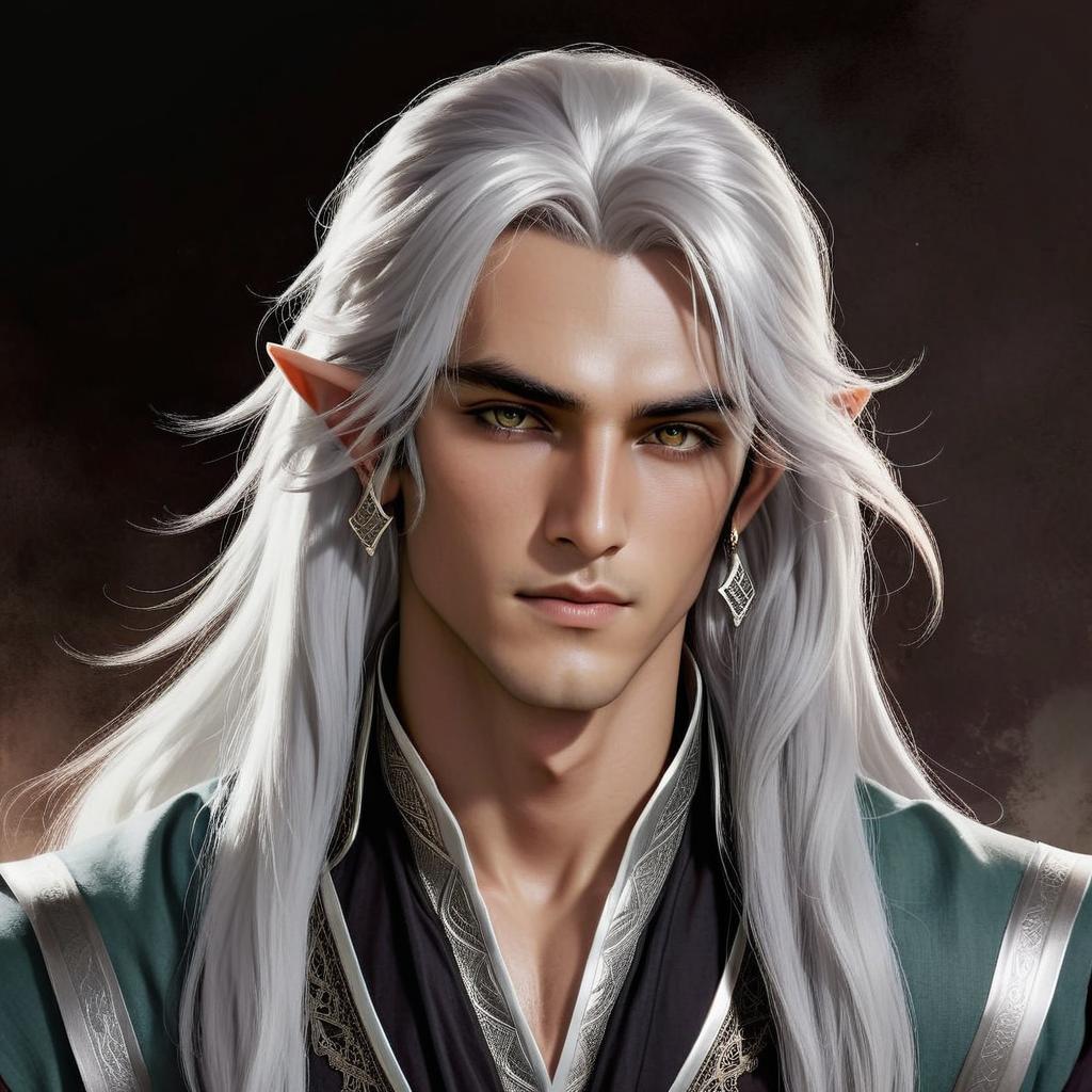 "A portrait of a young tan male elf with blackish-silvery long hair, silver colored eyes, and wearing Arabian garments."