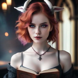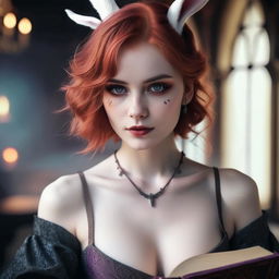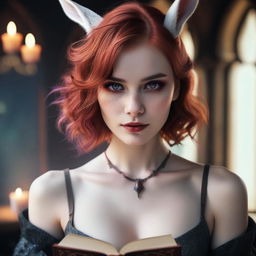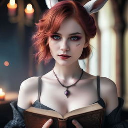 "A portrait of a young beautiful rabbitwomen with purple eyes and white and orange skin, holding a magicalbook, medieval style, 4k, realistic light, realistic, 8k, detailed"