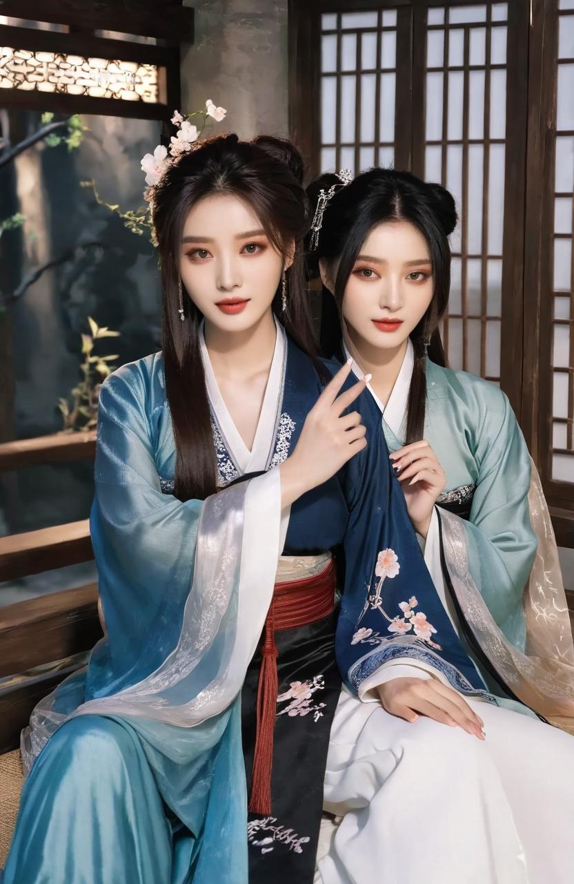 "I want to make cover baihe novel genre xianxia. Dont add letter anything. Just two girl with hanfu like the picture. The blue one is tomboy. And others is feminin"