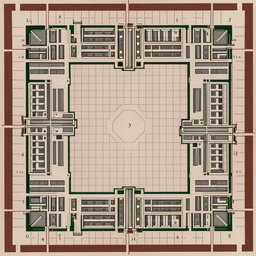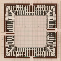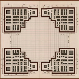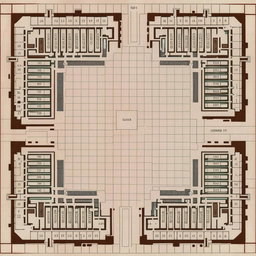 "Black and white drawing of a dwarven squared housing block. The housing block is viewed from the top and side. The housing block consists of 4 identical square buildings. Each building has 2 floors. There is a gap between the buildings so that there is enough room for a square plaza with a fountain in the center of ..."