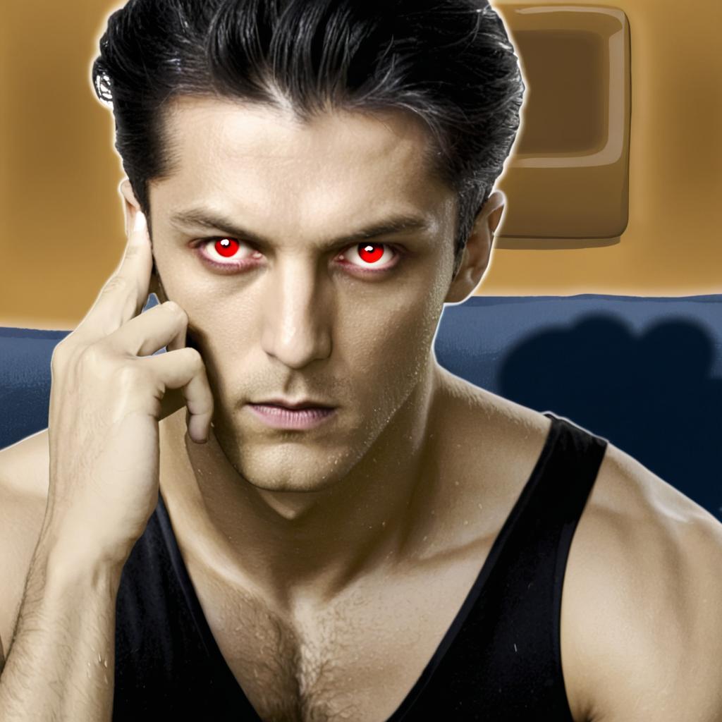 "red sharp eyes, handsome face, man, black hair, black towel pajamas, sitting on sofa, leaning hands on sofa, resting chin on palms. Wet Hair, expressionless."