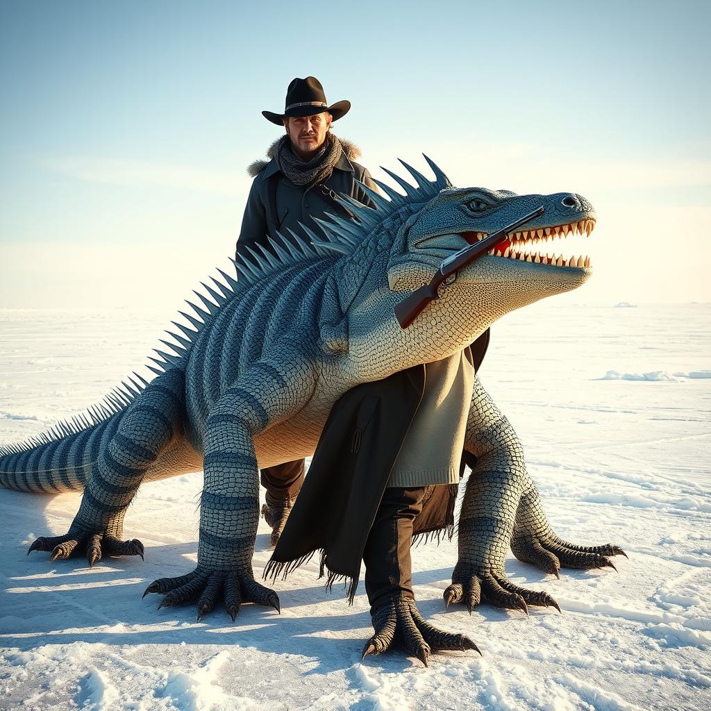 "twenty foot long Komodo dragon with six legs, long blue and white stripped fur, long sharp quills along its spine and a mouth full of shark like teeth, half curled behind a cowboy in a black hat and duster with a 1870 henry repeater rifle, standing on an frozen tundra"