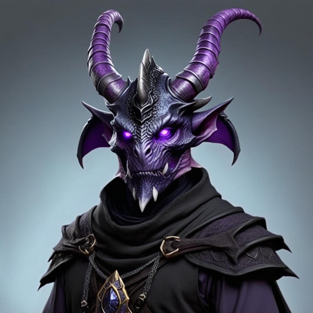 "dnd warlock clothed,dragonborn, skin "black to perlecent purple", purple snake eye, 200 cm tall, horns on the back of the head shorter horns"