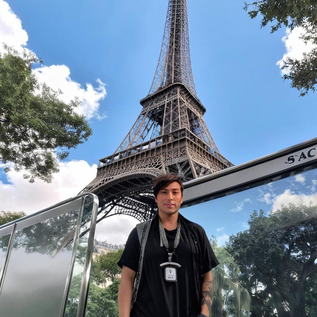 A Glimpse of Paris: Man Standing Tall Before the Eiffel Tower