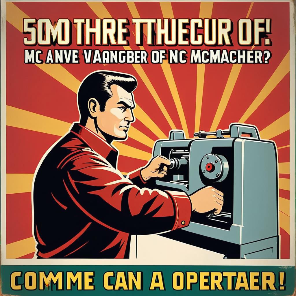 "Make a poster in the style of Soviet slogan posters of the 50s, which will popularize the profession of a CNC machine operator. It should depict a person working on a CNC lathe. The poster should motivate to work on the machine. Make the poster with absolutely no text. The poster should be made in white and red colo..."