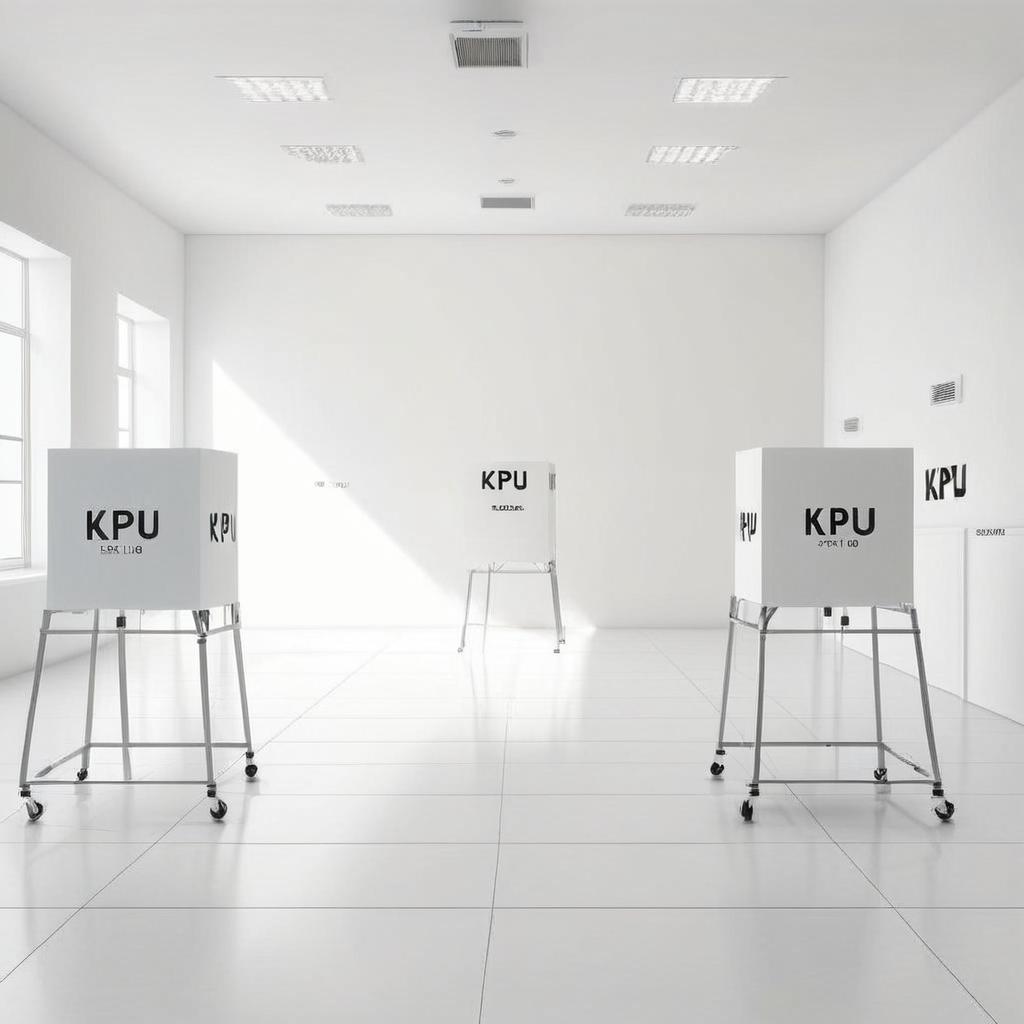 "make a background image about the KPU polling station. with white walls and white tiled floors. with no people. with only 4 polling stations that say KPU"