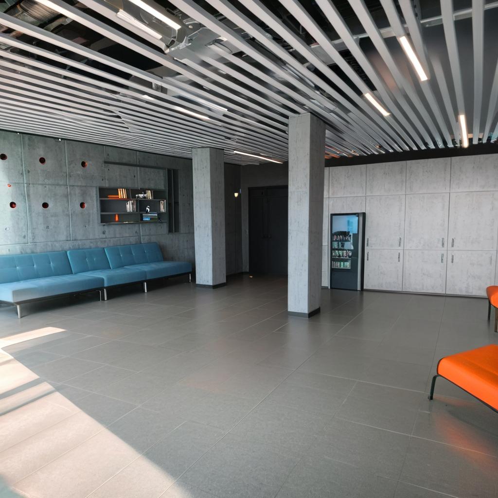 "pls make this space a cozy lounge for students to relax and socialize, with sofa sets, bookshelf, smart devices,with mixed color of white, blue, orange, grey, silver. And it would look modern smart."