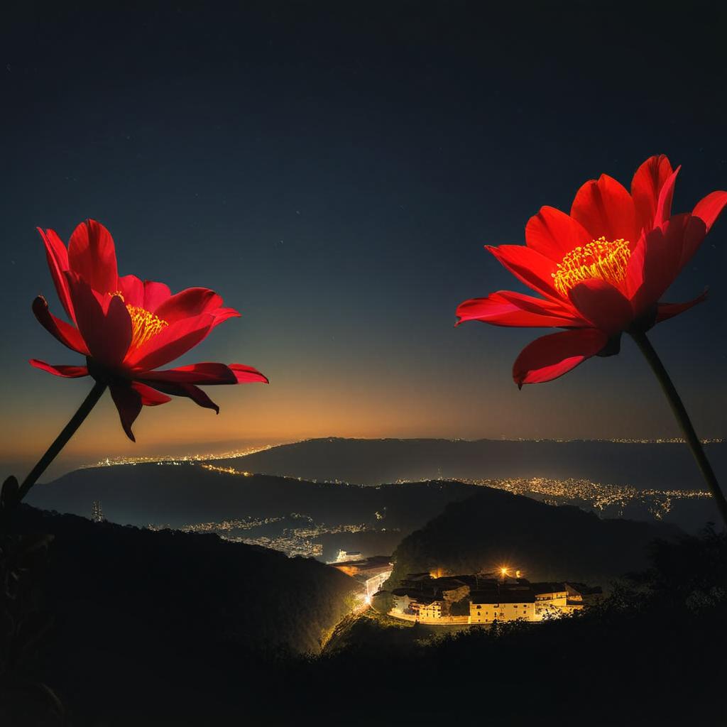 Moonlit Serenade: A Radiant Red Flower Blooms Amidst the City