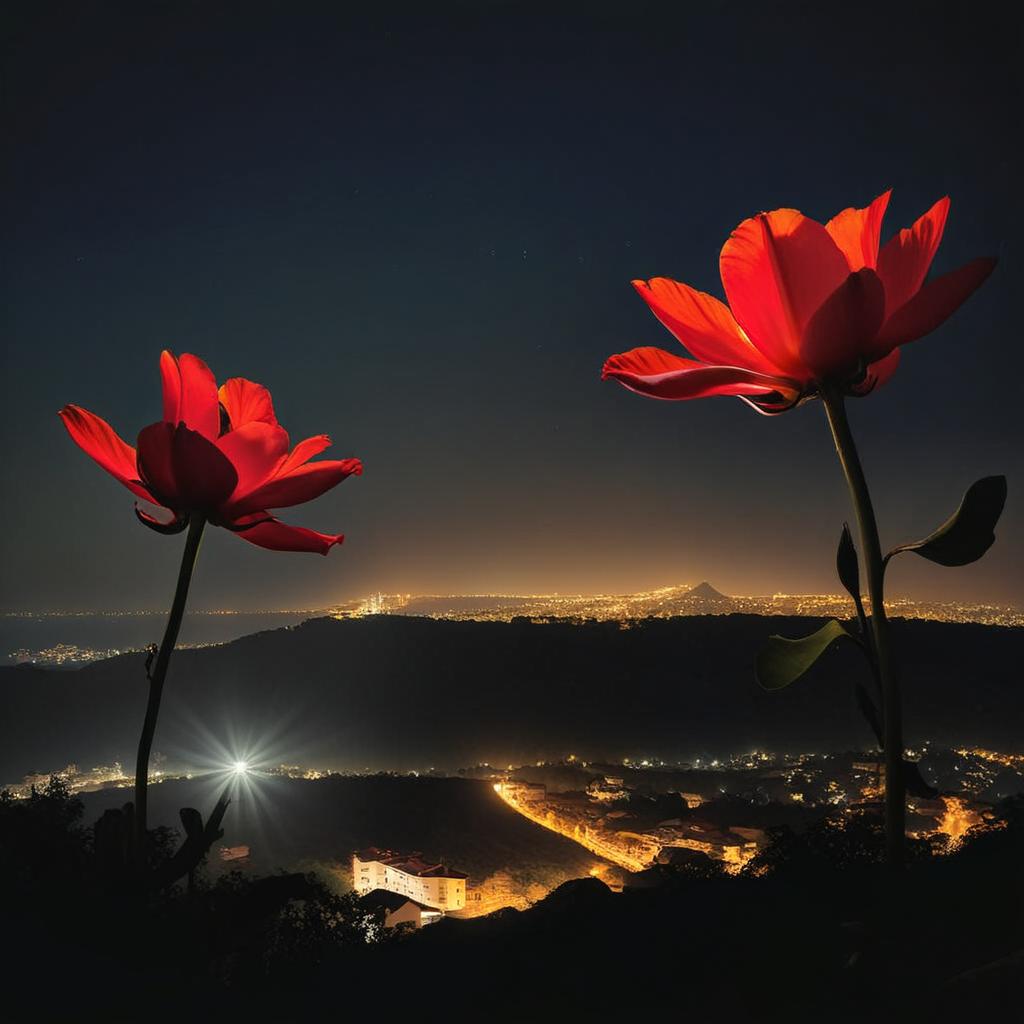 Moonlit Serenade: A Radiant Red Flower Blooms Amidst the City