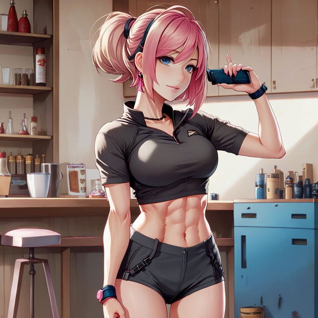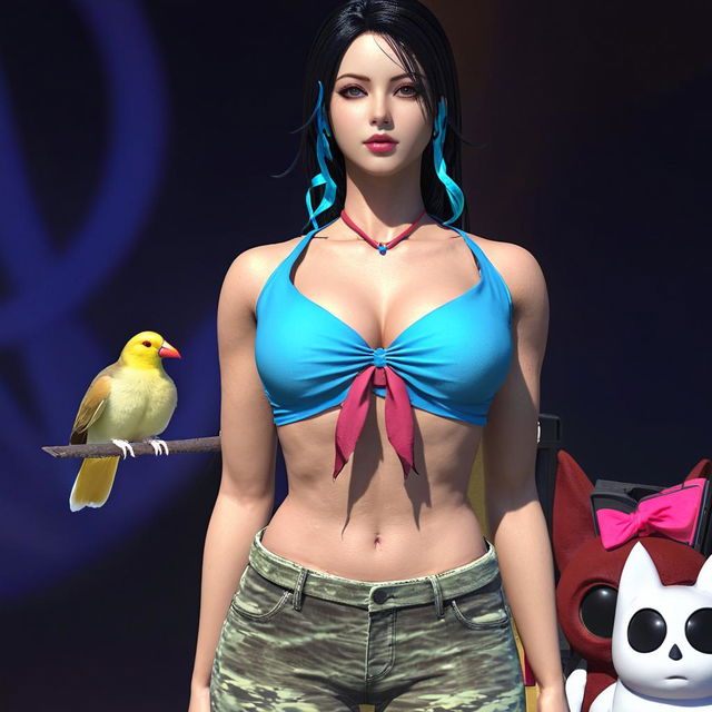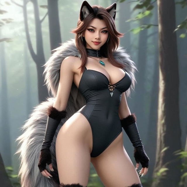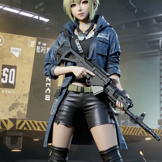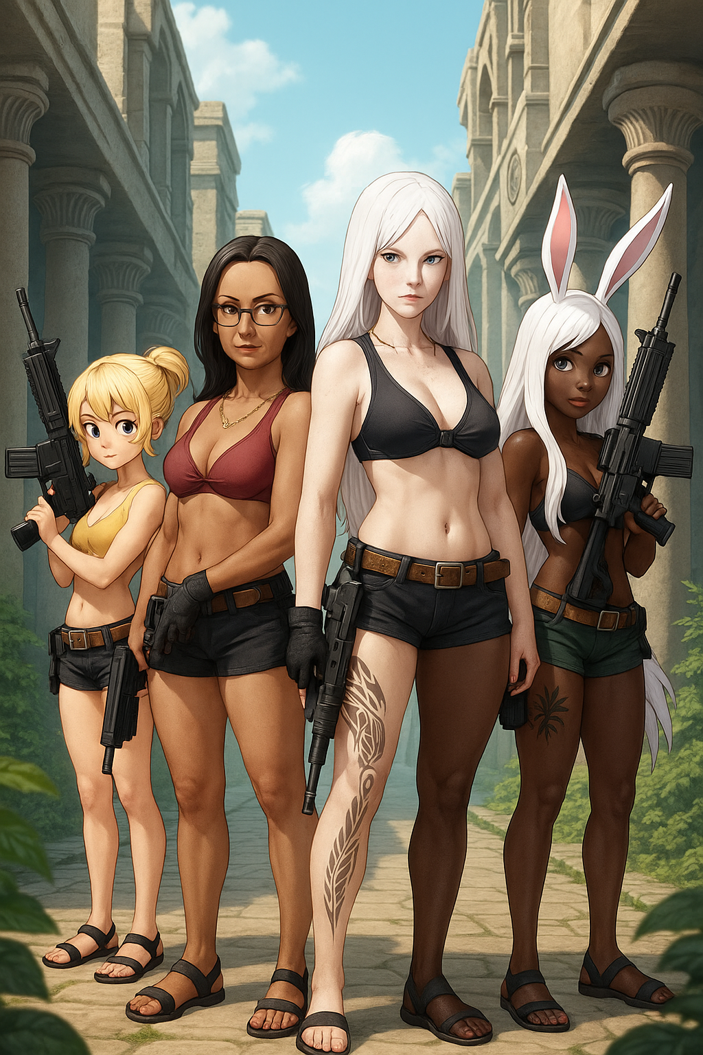 "A group of four stunning anime girls, dressed scantily, holding laser rifles, standing in the ruins of an ancient temple city. One is short, cute and blond. The second girl is a brunette. The third girl is tall and has long red hair. The last girl is black, has tribal tattoos, white hair, and bunny ears. Make the bu..."