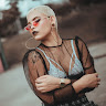 "A stylish Nigerian woman with low cut hair color in cream color , wearing large gold and white over-ear headphones, dressed in a pearl necklace, denim shirt, and white blazer. She has short, blonde hair, oversized round sunglasses, and an elegant expression. The background is softly lit and minimalistic.""