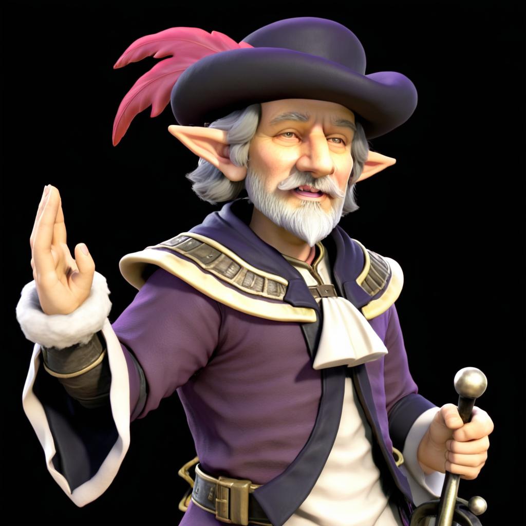 "Make a dungeons & dragons male comfy old halfling man, with a gray mutton chops beard. He also has long gray greasy hair. He is a bard and wears a purple glamourish outfit with gold accents and he also has a bard hat with a feather on it."