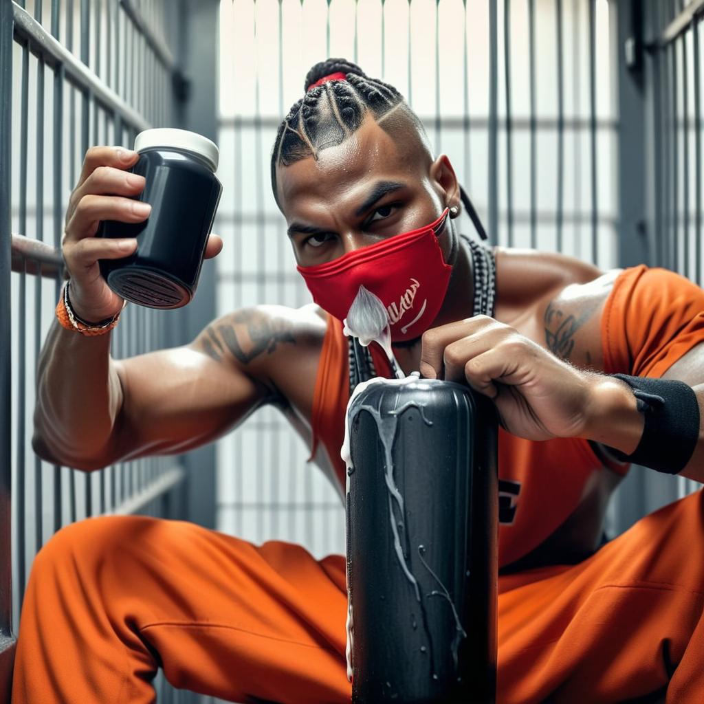 "close-up, a muscular african american gang member, baggy orange pants, red bandana mask (over mouth and nose), cornrows, sitting in prison cell, pouring moisturizer from black container over an upright large black baseball bat, bat dripping,"