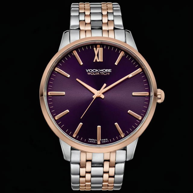 "Digital illustration of a rolex Submariner watch. the watch has a purple dial with a blue bezel and a white gold bracelet. the face of the watch is purple with a white gold hour and minute hand, and the rolex logo in the center. the hour markers are rose gold and white. the watch is surrounded by a futuristic citys..."