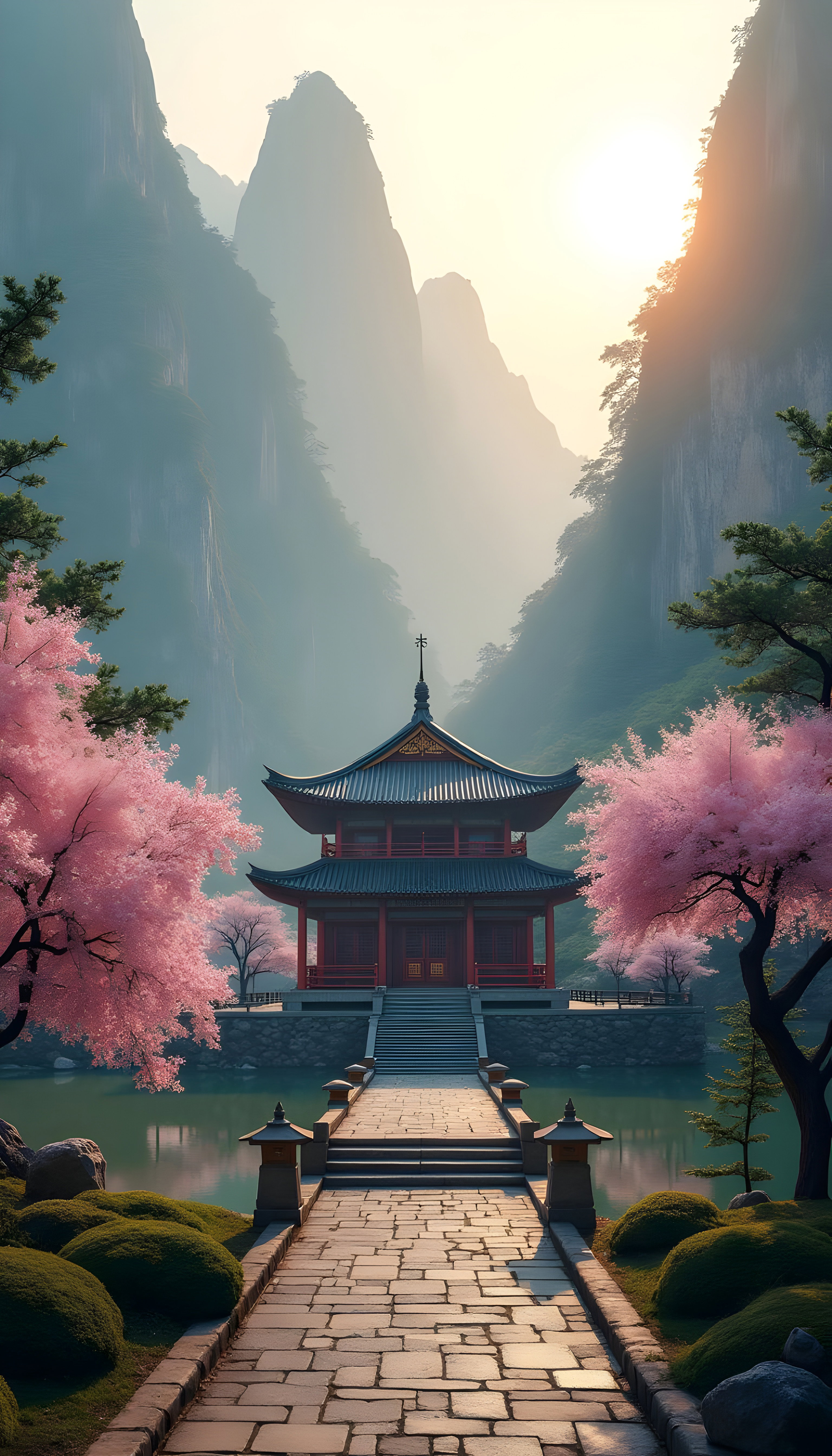 Ethereal Serenity: Japanese Temple Amidst Cherry Blossoms