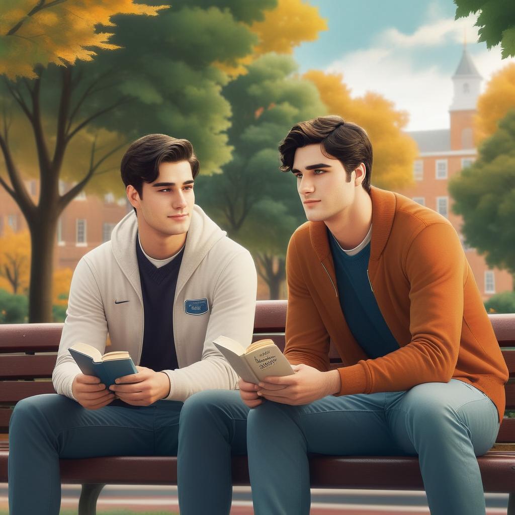 "In the heart of campus bustle, two White young men, their dark hair complementing fair skin, sit on a bench, both clad in college uniforms. Engrossed in conversation, their expressions exude mutual support and camaraderie. Surrounding them are symbols of learning: a stack of books and an illuminated lamp. Soft, warm..."