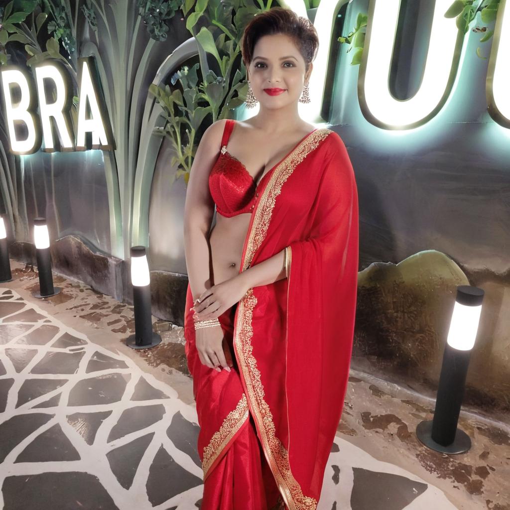 Bold Elegance: Actress in Vibrant Red Sari