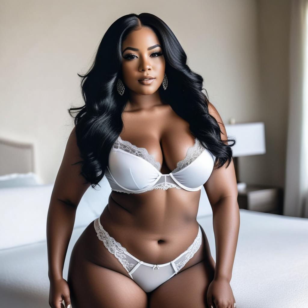 "Realistic photo of a Sexy curvy black woman with black long hair using a white lingerie"