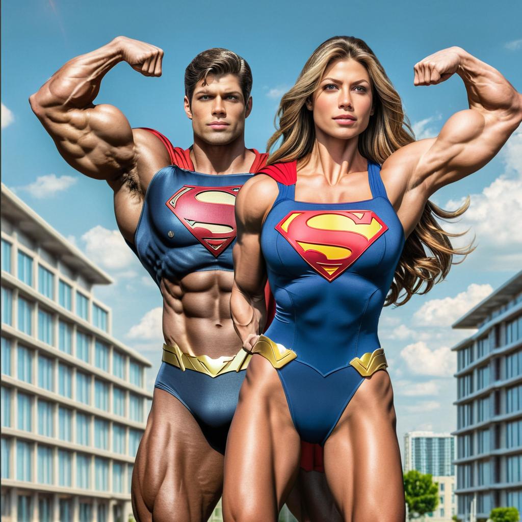 "Supergirl flexing her big biceps versus male vodybuilder"