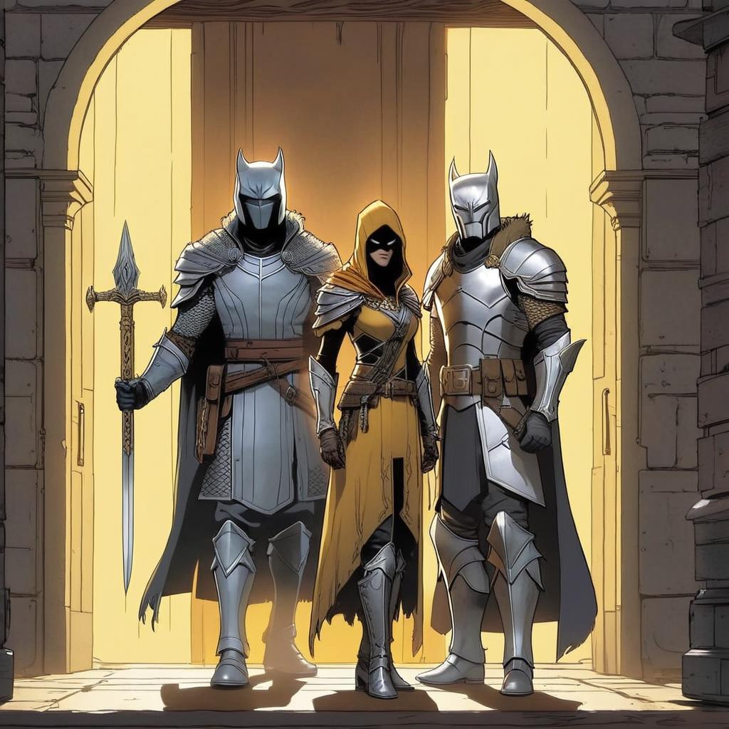 "Внутренняя часть замка, все окна на стенах заколочены, перед нами стоит большая двойная дверь закрытая доской, перед ней стоят три полупрозрачных призрачных война, слегка светящихся желтым светом, слева стоит табакси воин с луком, посередине воин человек, на нем нет маски и видно ллицо, в руках его большой двуручный..."