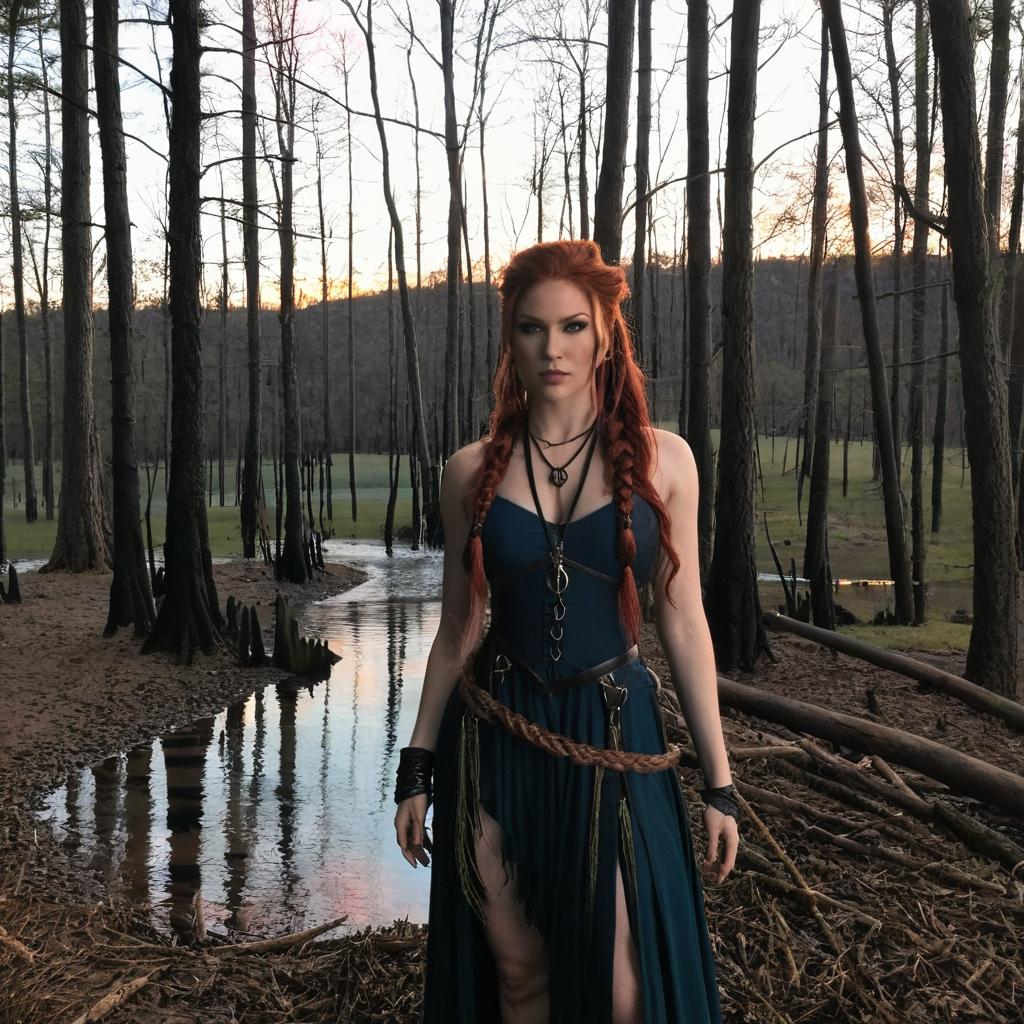 "ultra realistic wide frame photograph image of Kyra's whole body, a sexy young warrior witch, Her fiery red hair is perfectly done, intricately braided and her expression radiates love conveying the need for comfort after battle. Eyes are a piercing green. She wears a blue Celtic dress crafted from rich sheer silk, ..."