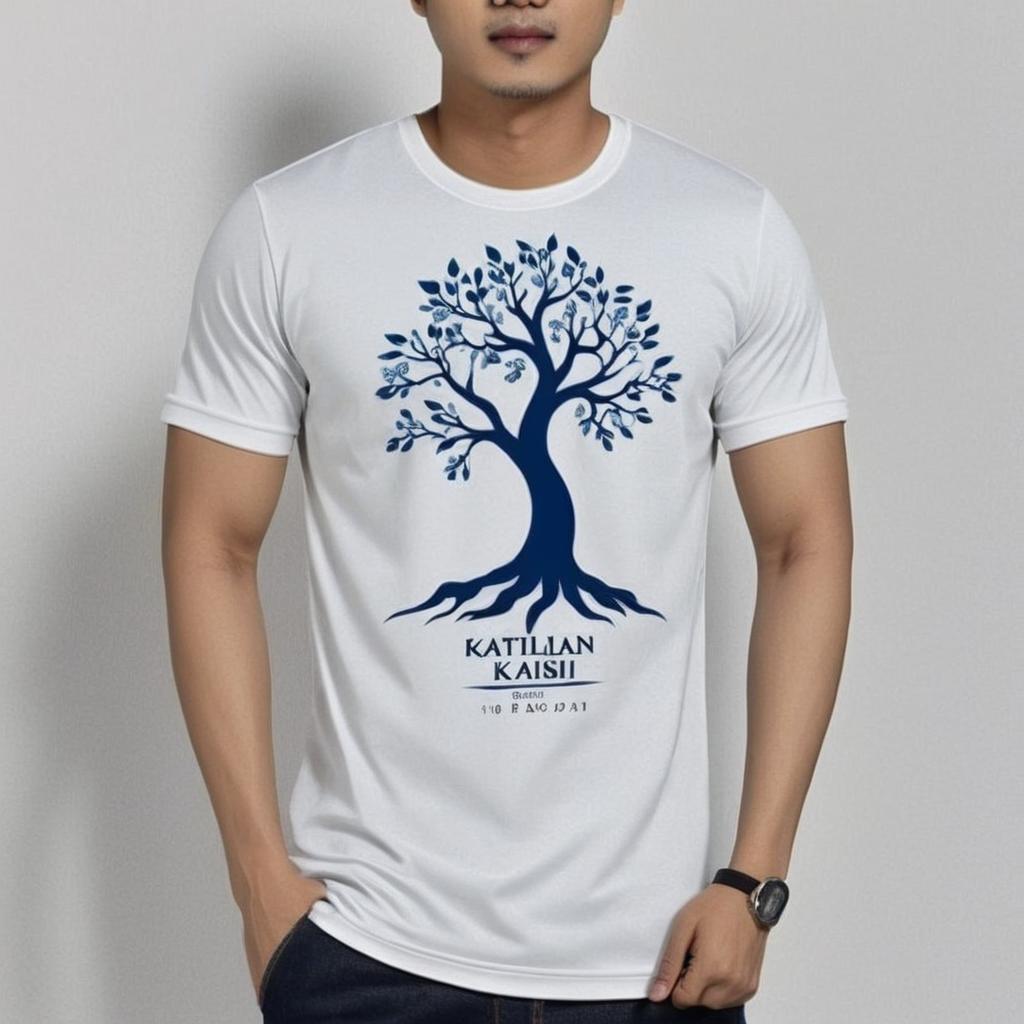 "Buatlah kaos putih polos desain pohon di atas di sebelah dada kiri, kemudian bagian belakang baju seperti kaos diatas tanpa batik di lengannya"