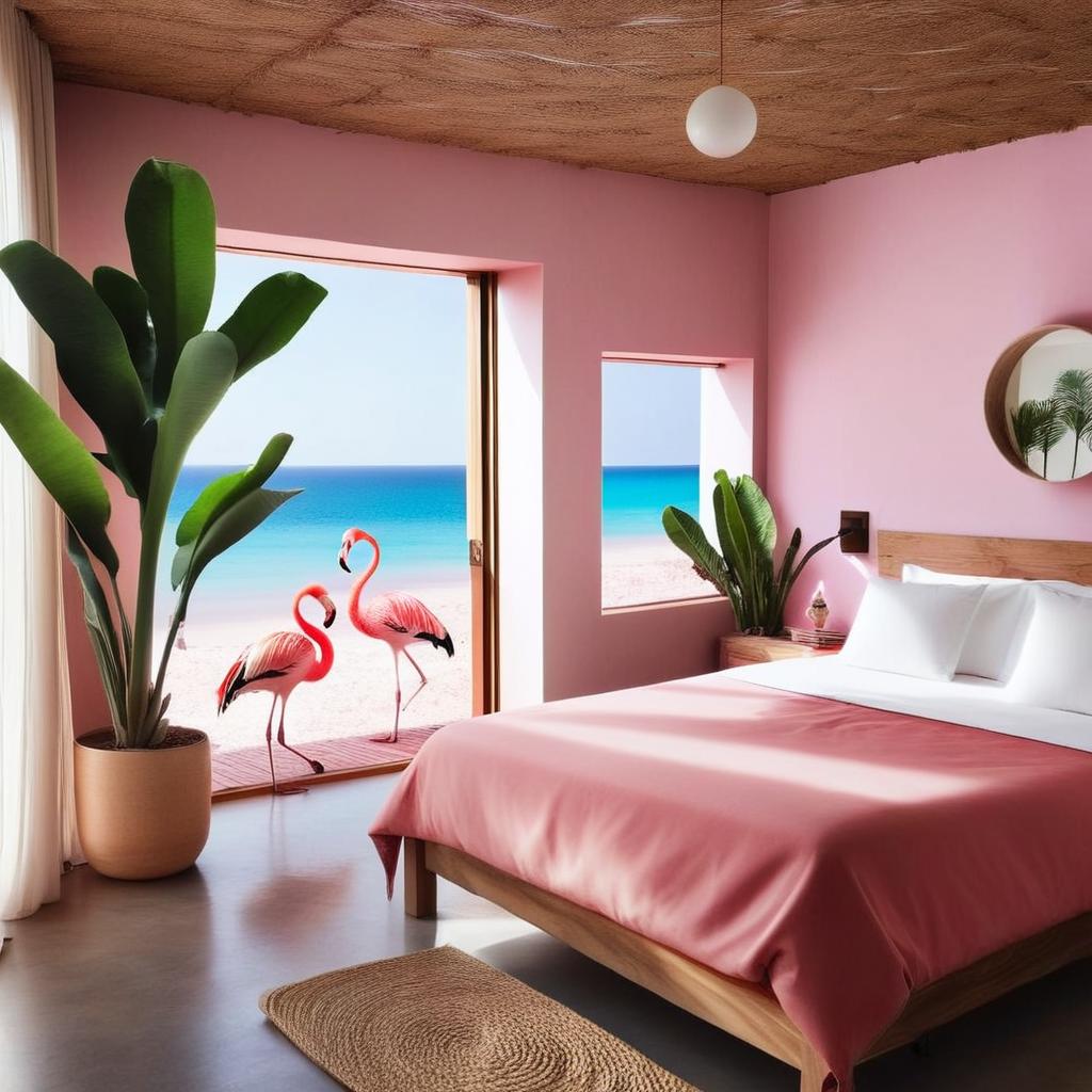 Blissful Ocean Getaway: Eco-Friendly Hotel Room with Flamingos